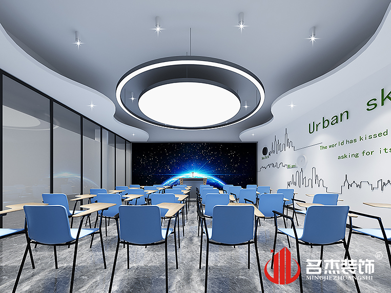 生物科技公司主要以傳統的白灰兩個配色作為辦公室裝修設計整體的色調,同時也在部門區域加入藍色作為點綴色。展廳部分則采用星空元素來作為整個空間的主設計元素,能夠展示出企業與眾不同的設計品味。整個空間利用大量的燈光打造明亮的,時尚的氛圍。